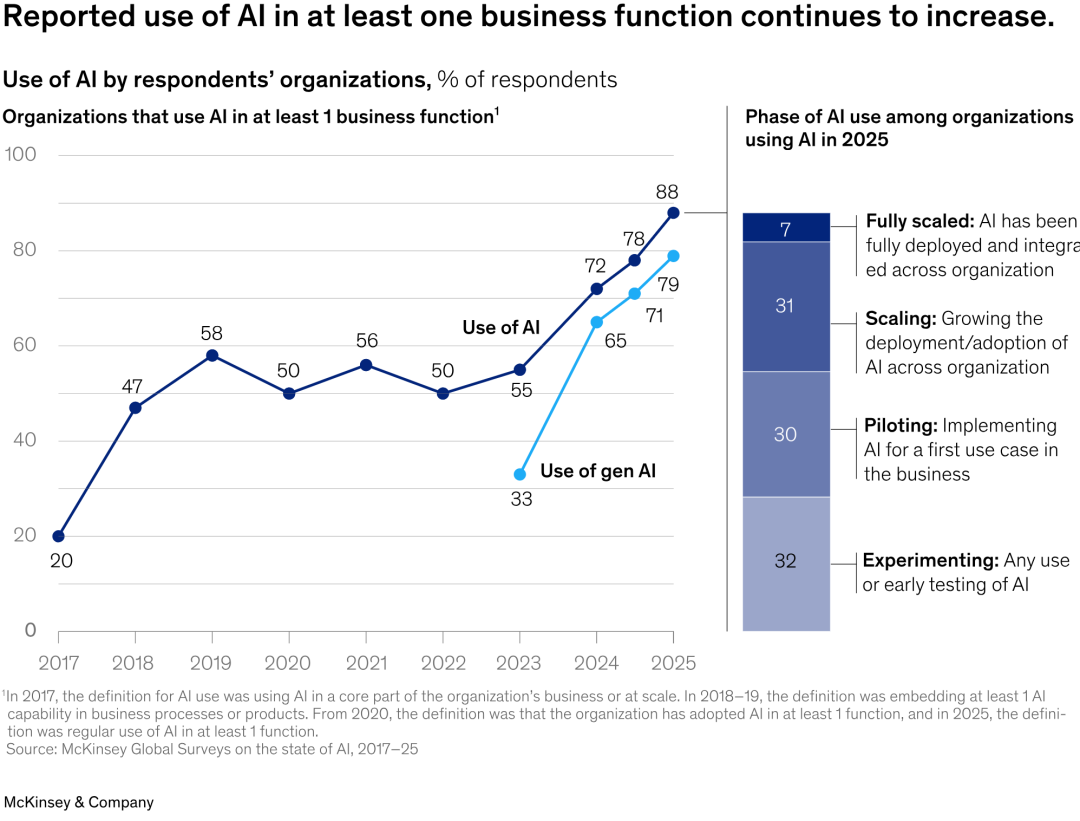 Según el informe The State of AI: Global Survey 2025 de McKinsey, el 88% de los ejecutivos confirma que sus organizaciones ya utilizan inteligencia artificial. Sin embargo, casi el 60% de las empresas aún carece de políticas formales para su uso. Adoptar esta tecnología es tu mayor oportunidad de crecimiento; formarte para utilizarla con estrategia y consciencia es la llave que desbloqueará tu potencial profesional.